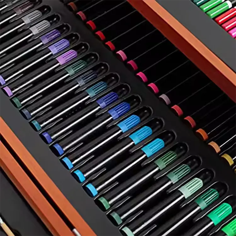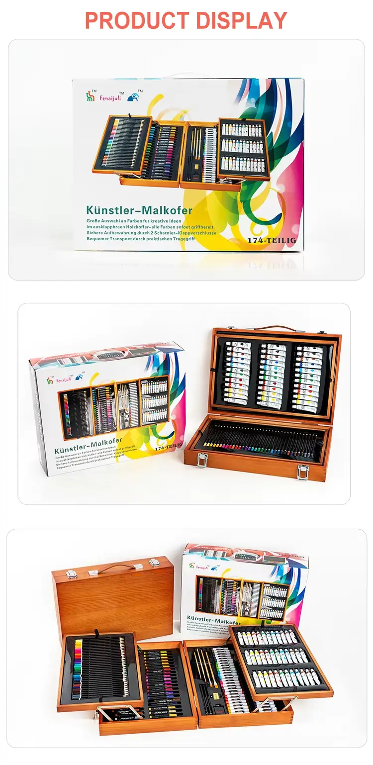 Das ist beliebt 174 Stück Kunstset We Ningbo Phyno (Art Supplies Factory) hergestellt, das enthält: 42 Farbwasser-Aquarell-Marker, 27 Farbölbasis, 34 Farbstifte, 2b/4b-Skizzstifte jeweils, 6#/8# Flat Peak Pinsel, 2#/4# Pinsel, 12 Farbunternehmen 12ml/12ml), 12m. Acrylfarben (12 ml) und Radiergummi/Bleistiftspitzer. Alle von ihnen sind Sicherheit für Kinder, wir haben bereits En71- und ASTM D-4236-Überprüfung erhalten.