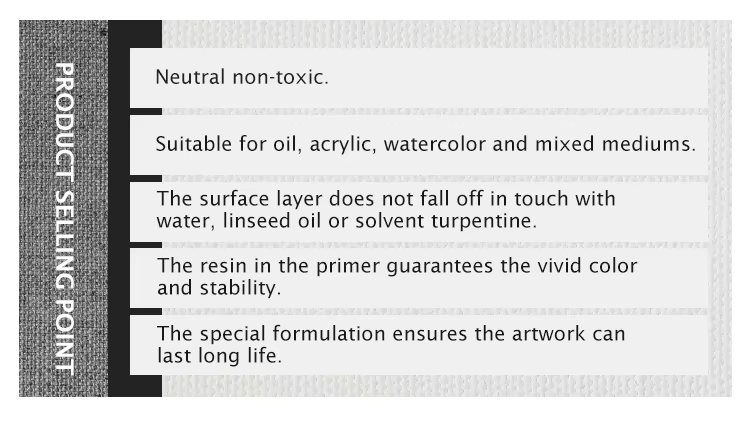 ● Lange Zeitdauer:Diese für die Zeichnung geschaffene Kunst-Leinwand. Der kilngetrocknete Kiefernrahmen widersetzt sich in 30% -70% Feuchtigkeitsumgebungen. Doppelprimierte Oberflächen akzeptieren Ölfarbe, Acrylfarbe und gemischte Medien ohne Blutungsdurchblutung.